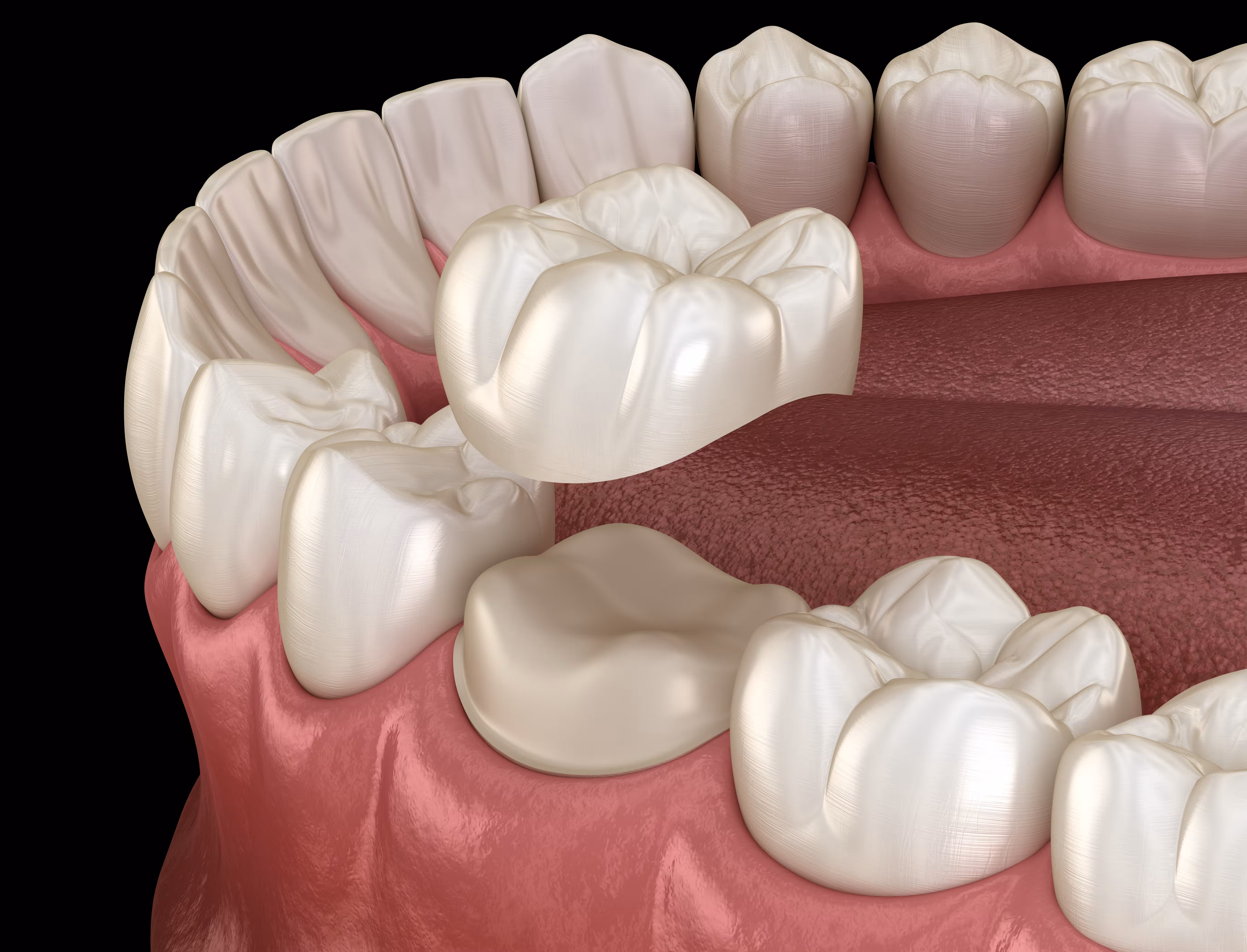 A dental crown is a full-coverage restoration that fits over a tooth like a protective cap. It restores the tooth’s shape, size, strength, and appearance. Crowns are often recommended when a tooth can no longer be repaired with a traditional filling or inlay/onlay.